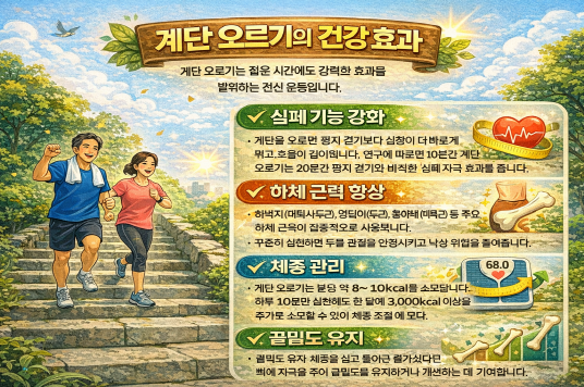 🪜 핵심요약 : 계단 오르기는 장비와 장소 제약 없이 가능한 생활 속 운동으로, 심폐 기능 강화·하체 근력 향상·체중 관리·골밀도 유지·스트레스 해소에 효과적입니다. 작은 습관을 꾸준히 이어가면 50대 이후에도 활력과 자신감을 지키는 강력한 건강 전략이 됩니다.